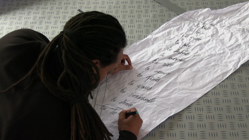 Com as crianças e adolescentes, de várias nacionalidades e culturas, as propostas de improvisação e convocação de imaginários próprios, trouxeram uma espessura de curiosidade e estranheza (habitar paisagens de fogo, ar, água e fogo; ser um roseira com pétalas delicadas e espinhos , criar movimento a partir de uma rede de palavras).